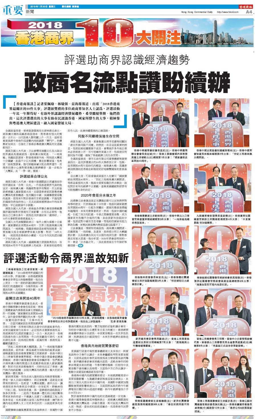 【香港商報网訊】記者葉佩瑜、林駿強、莊海源、張智榮、邱媛媛報道:出席「2018香港商界最關注的10件大事」評選頒獎禮的多位政商界知名人士認為,評選活動一年比一年辦得好,有助外界認識經濟發展趨勢,希望繼續舉辦。他們指出,這次評選選出的大事有助市民認識香港、國家所發生的大事,積極參與粵港澳大灣區建設,融入國家發展大局。