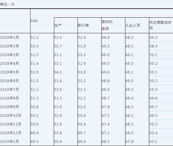 据统计局数据,2019年1月份,我国制造业采购经理指数(PMI)为49.5%,比上月微升0.1个百分点,连续第二个月低于荣枯线。