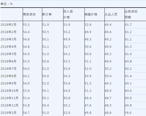 2019年1月份,综合PMI产出指数为53.2%,比上月上升0.6个百分点,景气度有所回升,表明我国企业生产经营活动总体增速加快。