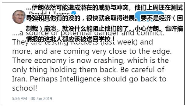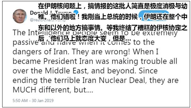 次日,特朗普在推特上连发两推,以伊朗仍在试射导弹为例,抨击情报界“消极”、“幼稚”,还用上了情绪化语言。