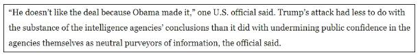 一名官员认为,特朗普对情报界的攻击“跟其得出的结论没有太大关系,他是希望借此攻击美国情报部门作为政治中立的信息源形象,令公众对其失去信心。”