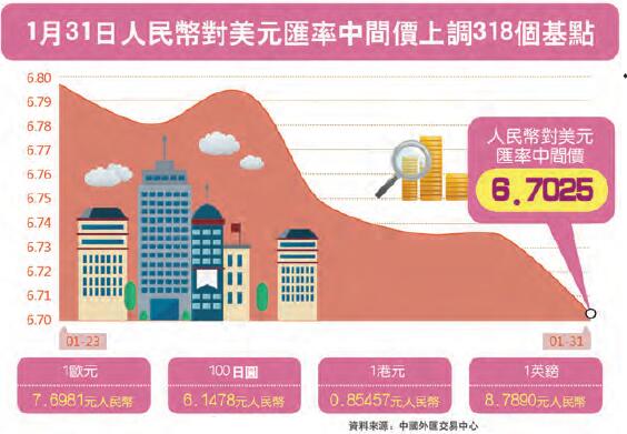 中國外匯交易中心公布人民幣對美元匯率中間價為6.7025,在不斷迫近6.6區間的同時創下逾半年新高,較上一交易日上調了318個基點。縱觀整個1月份,人民幣對美元匯率中間價則合計上漲1607個基點。人民幣對美元匯率中間價以一波「四連漲」在月終收尾。