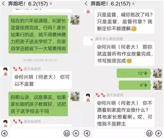 随后,学生李青的爸爸在群里发言:“现在的六年级课程,叫家长监督按质完成,行吗?家长如果行的话,就不用费神费力把孩子送进学校了,在家自学还能省下一大笔费用呢。”