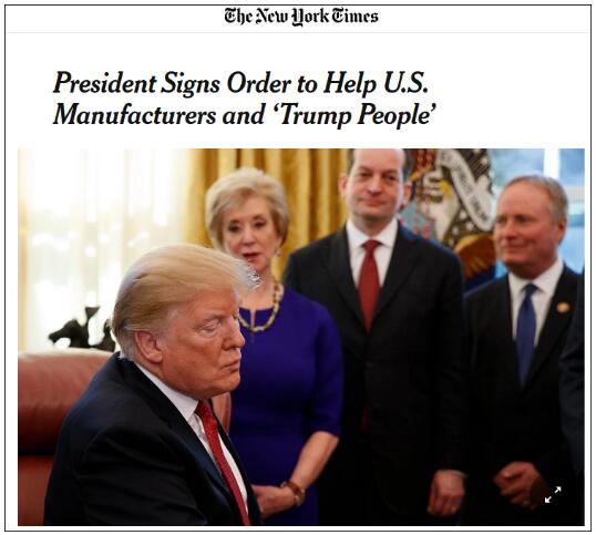 特朗普签署行政令,为了帮助美国制造业和“特朗普人民”。截图来自纽约时报