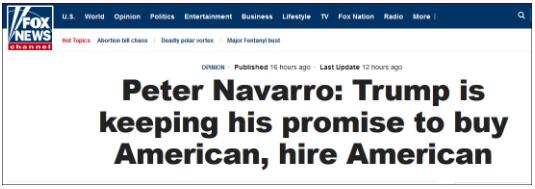 纳瓦罗:特朗普正在履行自己的承诺,“买美国货,雇美国人”。截图来自福克斯新闻