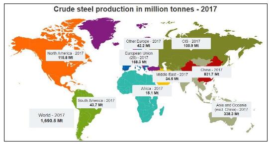 2017年世界粗钢产能(图片来源:世界钢铁协会)