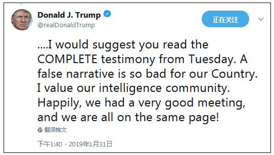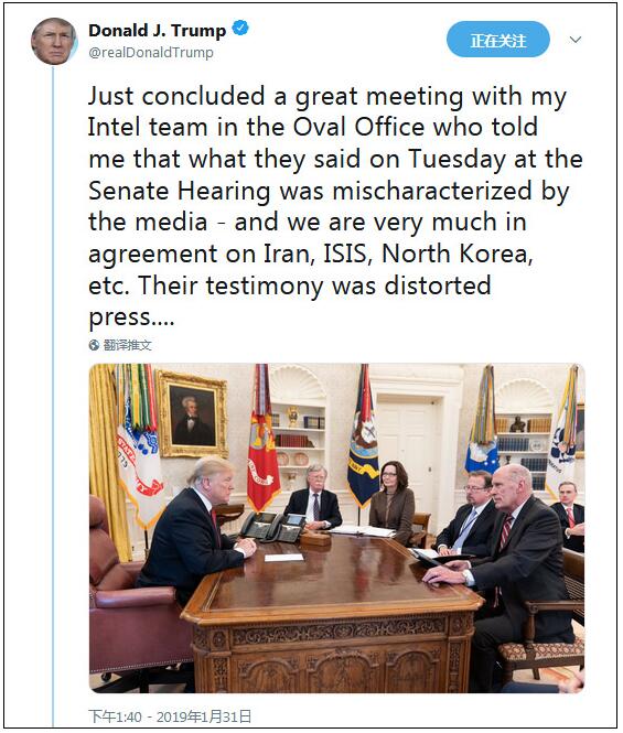 “刚在椭圆形办公室里和情报界的官员们开完会,他们告诉我,他们周二在参议院听证会上的证词被媒体给歪曲了-我们在伊朗、ISIS、朝鲜等问题上意见非常一致。”