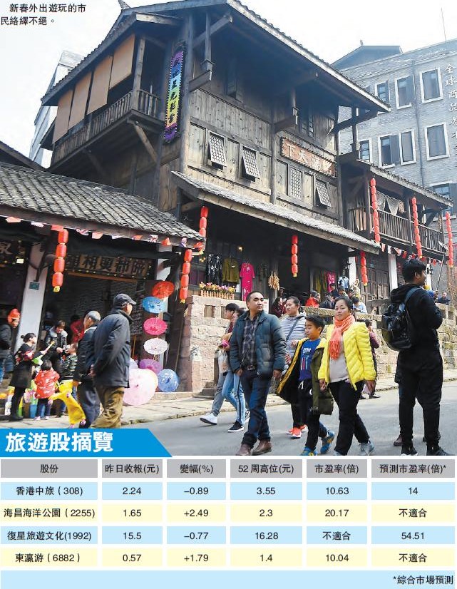 香港中旅(308)於1992年在香港上市,由香港中旅集團控股,主要業務是客運服務、景區業務、貨運及運輸業務、酒店業務、旅遊及相關業務等,現時是香港最大旅企。內地春運已經開始,有份參與內地旅運的香港中旅可受惠。此外,春節「家庭遊」人數增加,可再為中旅業績添彩。