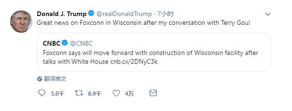 特朗普总统也在推特上发布了这次会面的消息,称“在我和郭台铭谈话之后,有个关于富士康在威斯康星州继续建厂的好消息!”