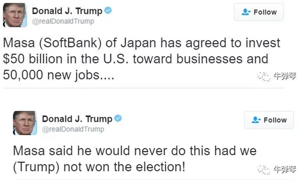孙正义宣布:为了表达对特朗普的支持,在美国投资500亿美元,帮美国创造5万个就业岗位。