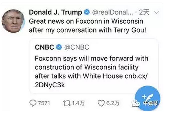 这次不是自己直接发推特了,而是转发了CNBC一条新闻,新闻是这样说的:经过和白宫交谈后,富士康表示,将继续推进威斯康星的工厂计划。