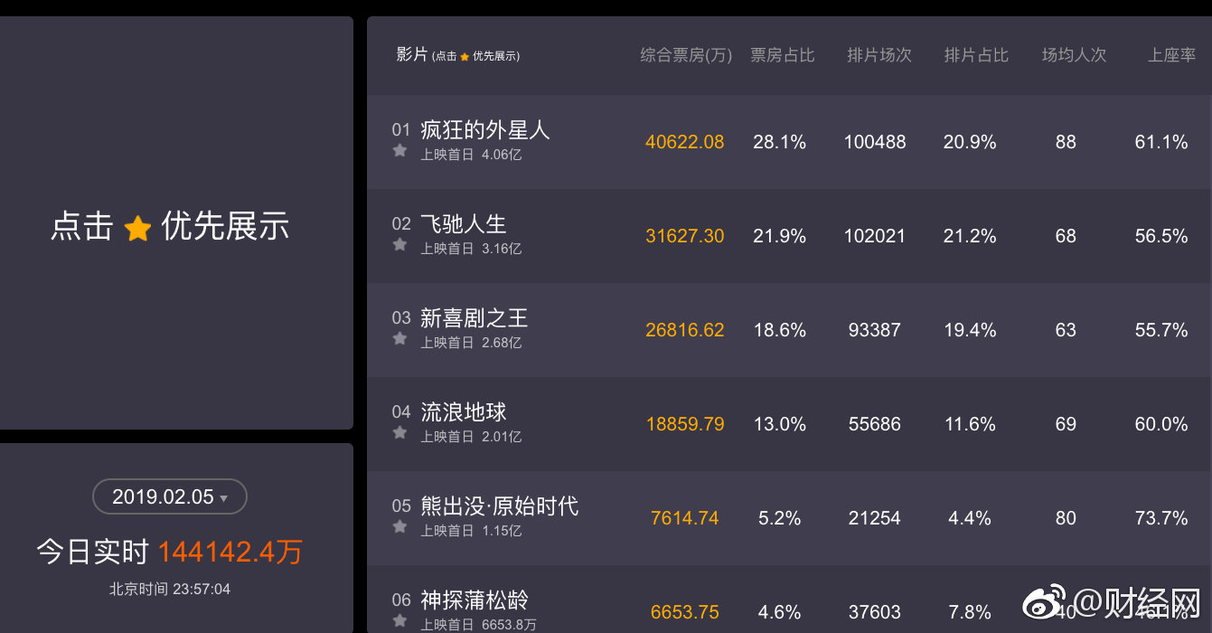 据猫眼实时数据,截至北京时间2月6日00:00,中国大年初一的全天综合票房收入逾14.44亿元人民币,创下国内单日票房历史新高,也打破了去年大年初一的新高纪录,同比涨幅13%。有分析预计,今年春节档,全国票房目标是70亿。
