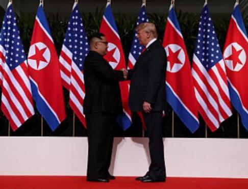 2018年6月12日,美朝首脑会晤在新加坡嘉佩乐酒店举行,这是在任的美朝领导人数十年来首次会晤。金正恩与特朗普先进行了历史性握手,随后又参加一对一会谈、双边扩大会议等。会晤期间,双方签署了历史性文件,就四项内容达成协议,包括朝鲜方面承诺“完全无核化”。美方则承诺向朝鲜提供安全保障。