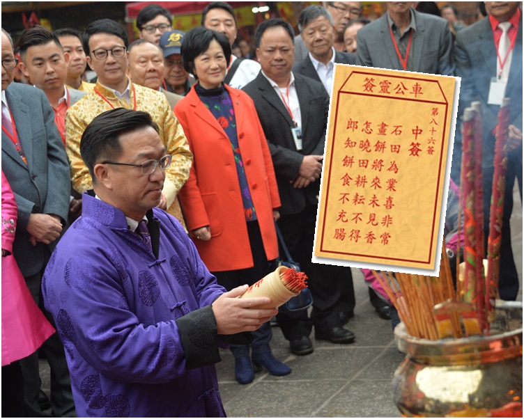 今日是大年初二車公誕,新界鄉議局主席劉業強早上按傳統習俗,到沙田大圍車公廟為香港求籤祈福。劉業強求得86號中籤,籤文為「石田為業喜非常,畫餅將來未見香;怎曉田耕耘不得,那知餅食不充腸」,解曰「出入謹慎,家宅不吉,自身平安,求財不遂」。