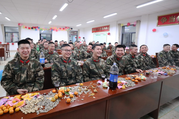 各中队全体官兵聚在学习室里共同收看联欢晚会,接连不断的笑声传遍了整个营区,炊事班早已悄悄准备好了热气腾腾的饺子,只等新年的钟声敲响之际,端到大家面前。