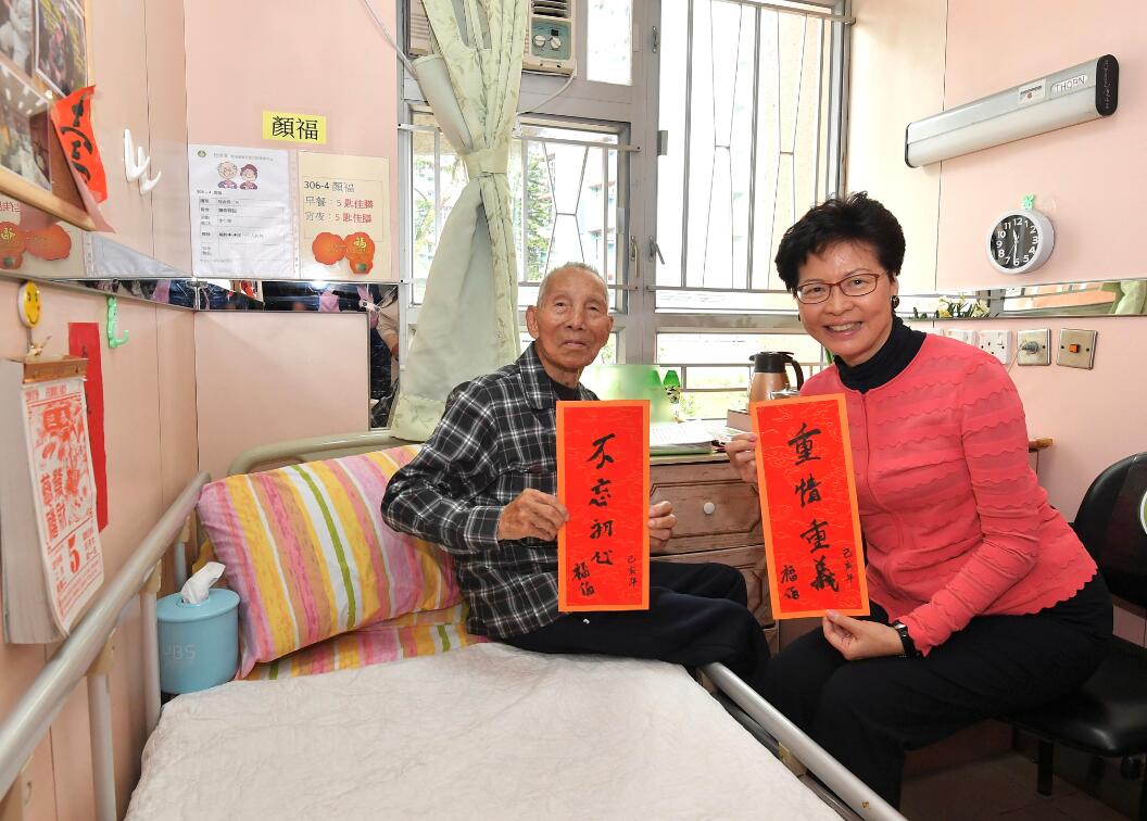 林鄭月娥隨後前往慈雲山一間老人院舍,探訪已年屆98歲的福伯。她在出任社會福利署署長時,已認識福伯,多年來都趁新春期間跟對方拜年。她同時向院舍其他長者送上甜柑,互相問候。當天晚上,她更出席香港旅遊發展局在尖沙咀舉行的新春花車巡遊,與民同樂。