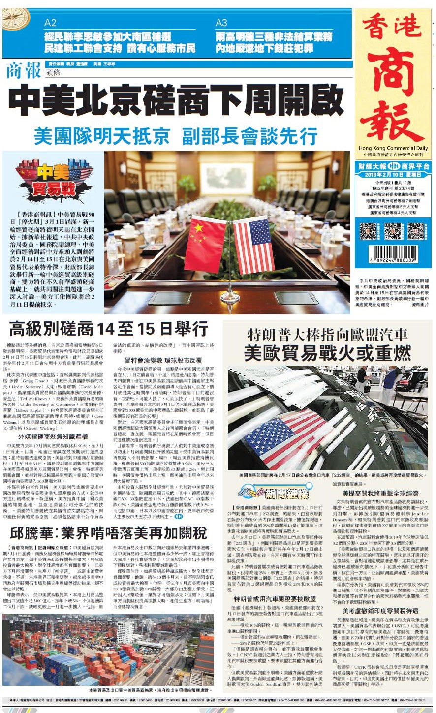 中美雙方去年12月初同意貿易戰休兵90天,至3月1日為止。目前,兩國正嘗試在最後期限前達成協議;屆時若無法達成協議,美國將對中國商品加徵關稅。1月30日至31日,國務院副總理劉鶴率中方團隊在美國華盛頓與美方展開貿易談判。會後,特朗普與劉鶴會面,並指對達成協議感到樂觀。劉鶴亦證實中國將會向美國購入500萬噸大豆。