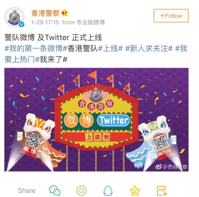 微博开通首日,香港警方共发文两条,其中一条贴文内容为