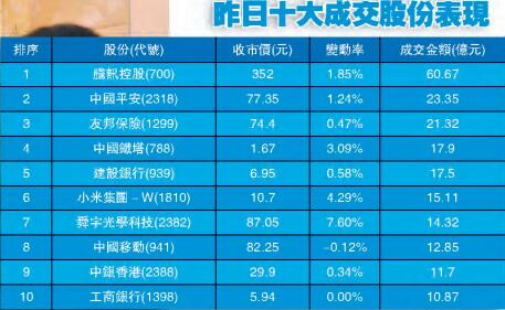 科技股方面,丘鈦(1478)升6.1%;個別5G股續炒,京信通信(2342)飆升10.5%;中興(763)升3.7%;鐵塔(788)升3.1%;中通服(552)升1.7%。市場憧憬MSCI明晟即將公布的季檢會納入小米(1810)和美團(3690),兩股分別飆4.3%和7.8%,美團更連升7日。另外,上周五急彈的美圖(1357)再升5.8%;擎天軟件(1297)升6.4%;網龍(777)升4.4%。