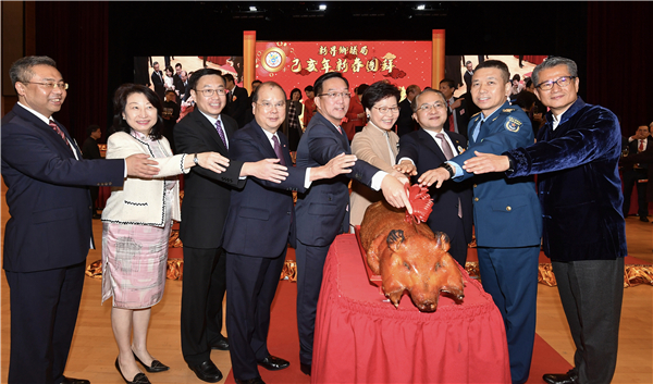 鄉議局昨日在位於沙田石門的鄉議局大樓舉行己亥年新春團拜,出席活動的林鄭月娥、王志民、外交部駐港特派員公署副特派員楊義瑞、駐港部隊副參謀長楊曉海及劉業強等主持了切金豬儀式。