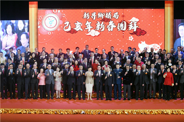 新界乡议局昨日举行新春团拜,主礼人与嘉宾在台上祝酒庆新春。记者 冯瀚文 摄