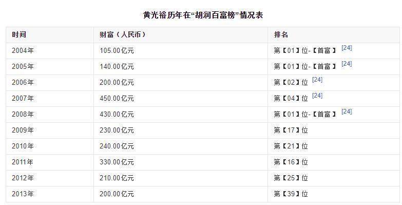 黄光裕也因国美的不断壮大 ,在2004、2005、2008年三度登上胡润百富榜首富,其中个人财富最高时达到450亿元。