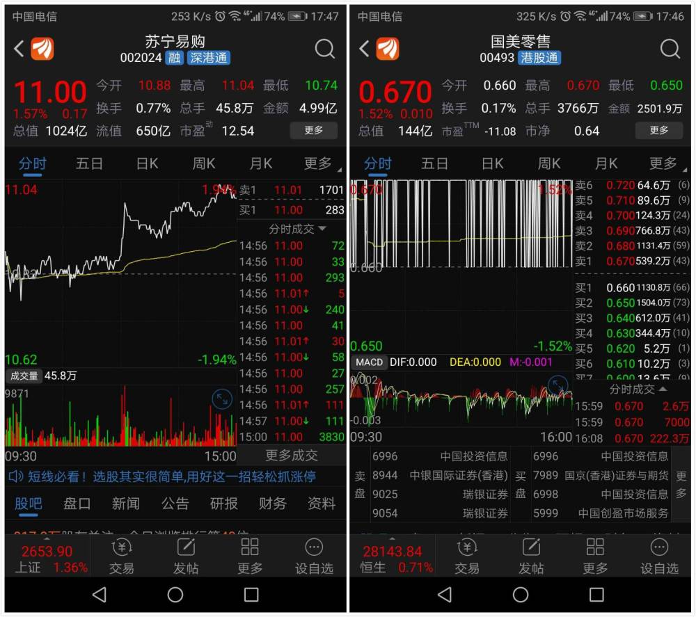 如今,两者的差距更是拉开了整整一个量级。截止2月11日收盘,国美零售报收0.67港元/股,总市值为144亿港元,约合123亿元人民币,而苏宁易购报收11元/股,总市值达1024亿元,两者相差近10倍。