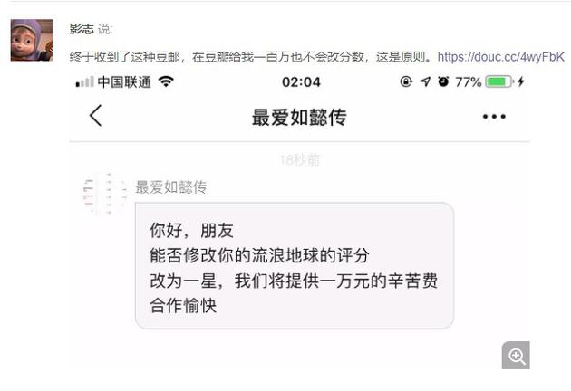 据前豆瓣电影主编、影评人“影志”12日凌晨发布的消息,有网友向其提出修改《流浪地球》评分为一星,可提供一万元辛苦费的请求。不过影志表示不会更改分数。