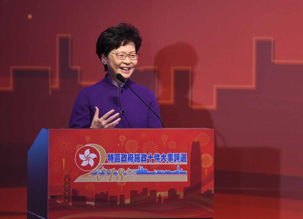 林鄭月娥在致辭中表示,廣深港高鐵和港珠澳大橋通車,如自己一年前的預期成為今年的施政十大事件,這是「理所當然」,因為兩項重大跨境基建為香港帶來了無限機遇,亦讓香港市民出行更方便。