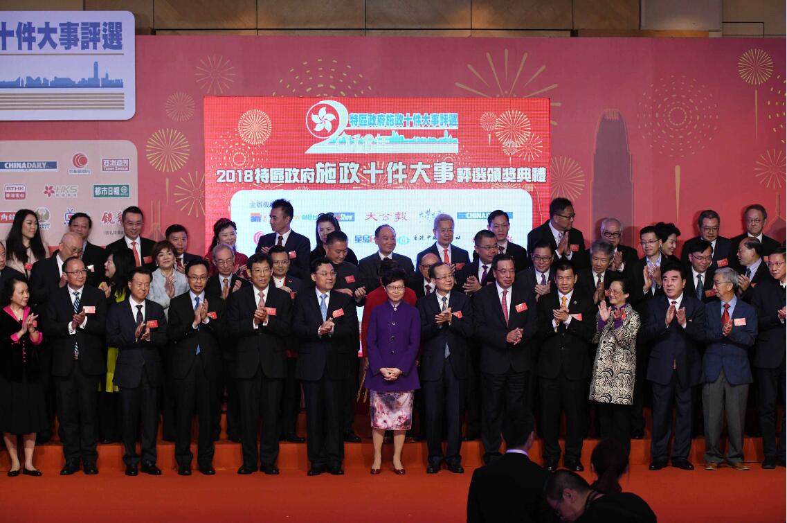 「2018特區政府施政十件大事評選」頒獎典禮昨日於會展舉行。頒獎典禮嘉賓雲集,林鄭月娥,外交部駐港特派員公署特派員謝鋒,中聯辦副主任楊健,全國政協委員、香港大公文匯傳媒集團董事長姜在忠,立法會主席梁君彥,政制及內地事務局局長聶德權,全國政協常委許榮茂、譚錦球、林淑儀等出席並主禮活動。此外,主協辦機構代表和社會各界知名人士等400多人參加了活動。