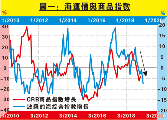 先看整體商品。若然市場對商品需求增加,航運需求及價格也應如是,兩者同向。然而CRB商品指數最大佔比是油價,但BDI側重於礦石及農產品,因此在油價增長於2010年明顯加快時,兩者出現短暫背離。不過整體而言,回歸分析得出BDI增長領先商品指數增長關係成立,前者走勢略領先後者兩個月(如圖一顯示)。觀乎BDI增長其實於2017年開始回落,去年更見收縮,因此估計商品指數在未來兩個月將繼續萎縮,商品市場短線前景仍然疲弱。