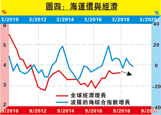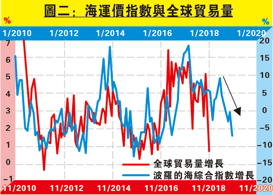 國際航運行情同時反映全球貿易狀況。因此圖二可見BDI增長與全球貨品貿易量增長成正比,前者領先後者十個月。BDI增長放緩下,料全球貿易量增長在未來十個月面對下行壓力。