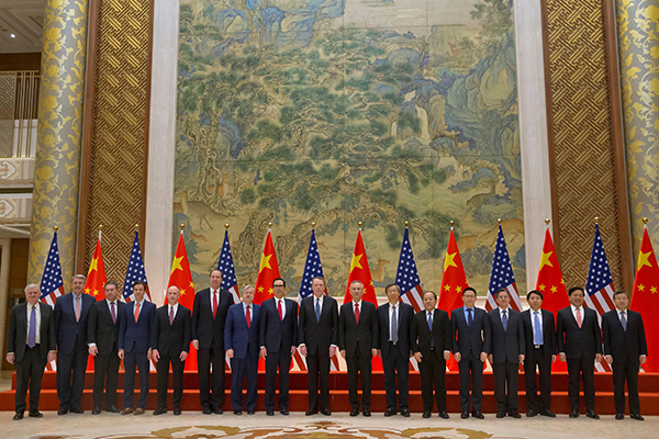中美經貿高級別磋商代表團昨日在釣魚台國賓館合影。 路透社