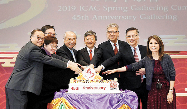 白韞六(中)、各部首長及前任和現任諮詢委員會主席一同慶祝廉署45周年。