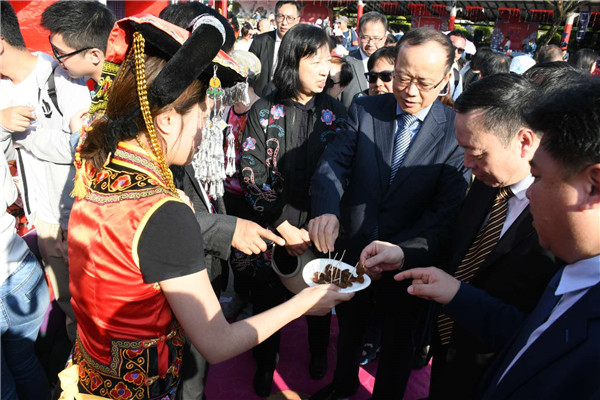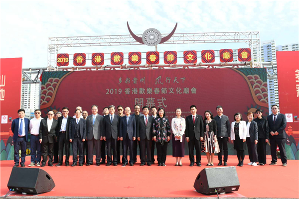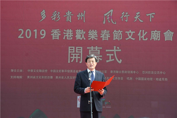 【香港商报网讯】2月16日,「山地公园省·多彩贵州风」——2019香港欢乐春节文化庙会开幕式在沙田公园举行。中央人民政府驻香港特别行政区联络办公室副主任杨健,贵州省委常委、宣传部部长慕德贵,中国友好和平发展基金会理事长李希奎,康乐及文化事务署署长、太平绅士李美嫦,香港旅游事务署专员黄智祖,中华文化联谊会理事白冰出席活动,并为开幕式剪彩。