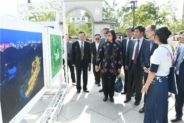 中央人民政府驻香港特别行政区联络办公室副主任杨健(右三),贵州省委常委、宣传部部长慕德贵(右四),中国友好和平发展基金会理事长李希奎(左三),康乐及文化事务署署长、太平绅士李美嫦(左二),贵州省委宣传部副部长、贵州省人民政府新闻办公室主任哈思挺(右一)合影留念。