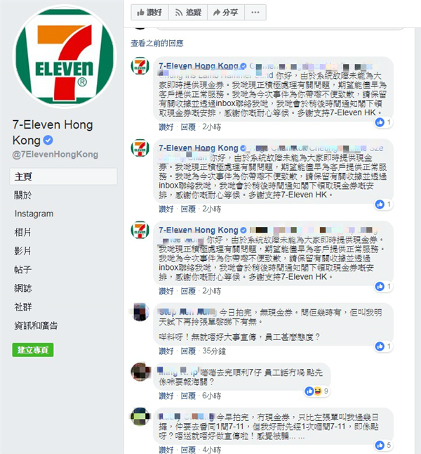 7-11便利店專頁解釋,「由於系統故障未能為大家即時提供現金券」,現正處理有關問題,期望能盡早為客戶提供正常服務。7-11便利店為今次事件帶來不便致歉,建議顧客保留有關收據並透過inbox聯絡,職員會於稍後時間通知顧客領取現金券的安排。
