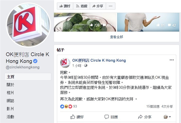而OK便利店也在Facebook專頁公布,「抱歉。今早9時至9時30分期間,由於有大量顧客領取交通津貼及OK 現金劵,系統未能負荷而曾發生短暫故障。」OK便利店已立即跟進並提升系統,於9時30分恢復系統運作。