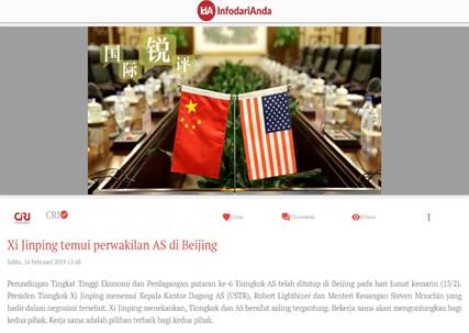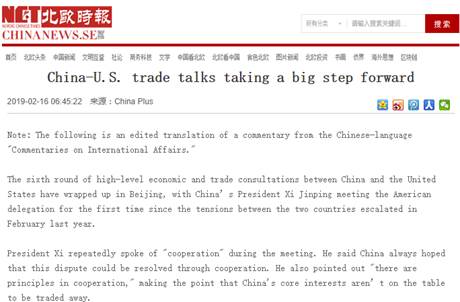 央视网消息:中央广播电视总台“国际锐评”2月15日刊播题为《习近平首见美方代表 两国元首引领经贸“加减法”》的文章。众多境外媒体和网站转发。