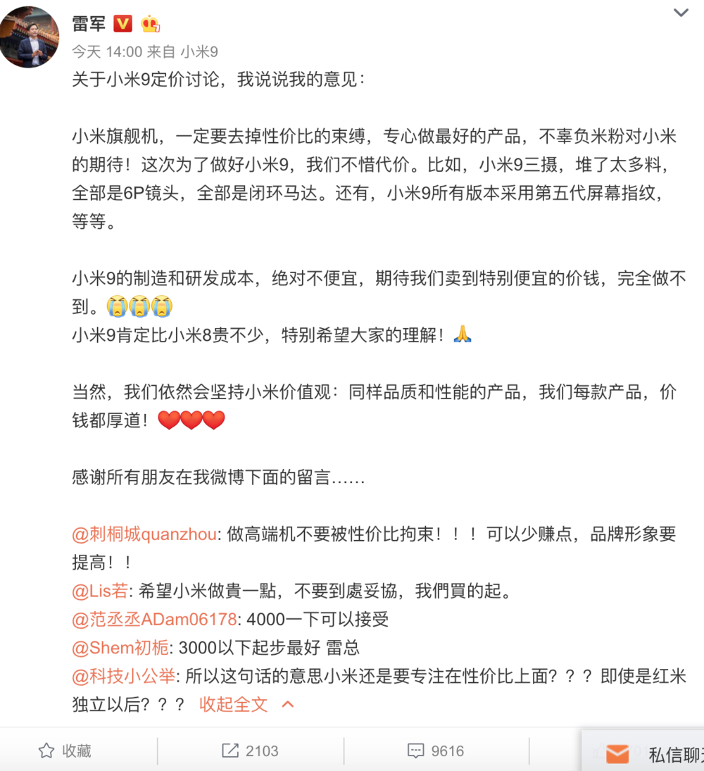 “小米9肯定比小米8贵不少,特别希望大家的理解!”至此,小米正式告别了性价比时代。