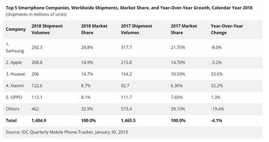 根据IDC的统计,去年三星的出货量下滑8%到2.92亿部,苹果跌3.2%到2.08亿部,如果这两大品牌在今年没有更大作为甚至继续保持颓势,华为或将有机会在2019年底就挑落三星,坐上全球智能机第一的交椅。