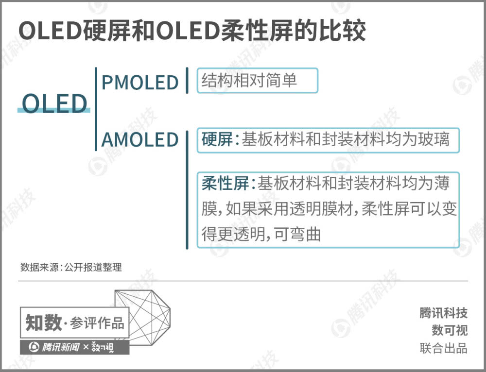 OLED驱动方式分为被动式(PMOLED)以及主动式(AMOLED)两种。 目前我们常说的OLED,均为AMOLED。AMOLED又分为硬屏和柔性屏,由于柔性屏透明度更强,它因此成为了OLED硬屏的进阶技术,也是未来手机显示技术的新趋势。