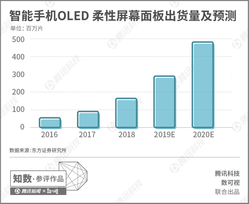 随着智能手机全面屏趋势的扩大,OLED柔性屏的出货量也实现了迅速的增长。2016年,世界范围内智能手机的OLED柔性屏版面出货量仅为9000万片,到了2018年,全年出货量就达到了1.6亿片,而且其增长趋势还在上升。