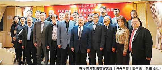 香港僑界社團聯會日前假銅鑼灣皇室堡設宴歡迎2019「四海同春」藝術團。中國僑聯文化交流部部長劉奇、中央統戰部僑務事務局副局長邱立國、中旅集團總經理吳熹安、中國僑聯文化交流部處長姜英會、中央統戰部僑務事務局副處長潘磊等蒞臨出席。