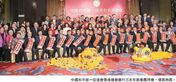 【香港商報网訊】記者霄虹報道:中國和平統一促進會香港總會日前在南洋酒店舉行己亥年新春團拜會,中聯辦副主任楊建平、台務部部長楊流昌,中國和平統一促進會香港總會理事長盧文端、監事長林建岳、會長姚志勝、常務副會長兼秘書長王國強、名譽會長李大壯、創會理事長楊孫西、創會會長高敬德、榮譽會長黃英豪等出席。楊建平分享了自己對國家主席習近平最新講話的體會。會上有醒獅表演,場面熱鬧。