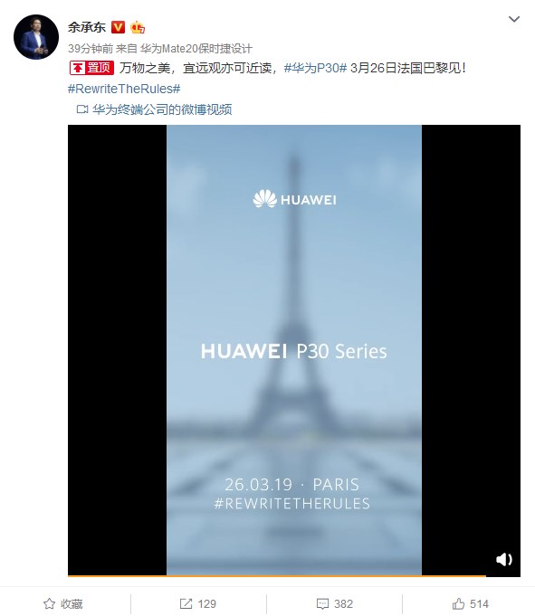 IT之家2月19日消息 今天上午,华为消费者业务CEO余承东正式宣布:万物之美,宜远观亦可近读,#华为P30#?3月26日法国巴黎见!