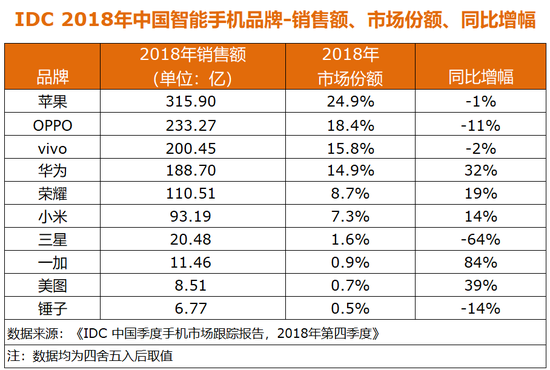 在销售额方面,苹果、OPPO、vivo、华为、荣耀占据前五名,市场份额之和超80%,但仅华为、荣耀实现了销售额的同比正增长。小米以93.19亿美元排名第六,三星、一加、美图、锤子手机同时跻身TOP10。(张俊)