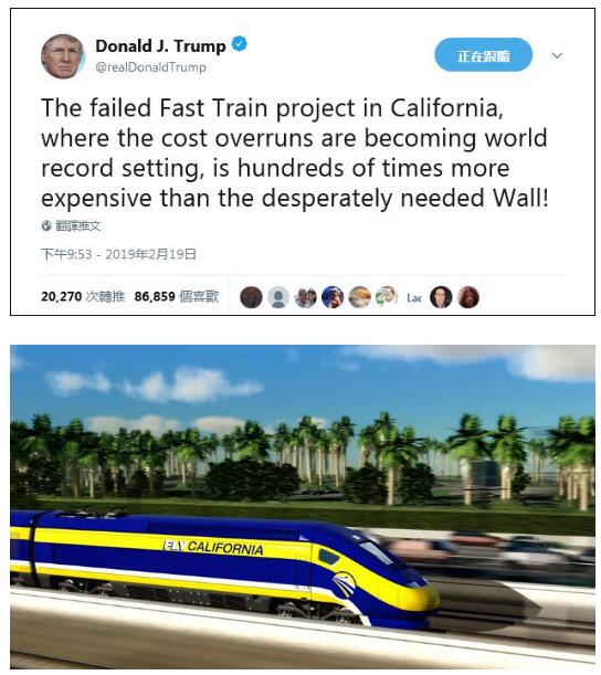 “加州失败的高铁项目,其成本超支创下世界纪录,比迫切需要的那堵南部边境墙还贵上百倍!”特朗普说。
