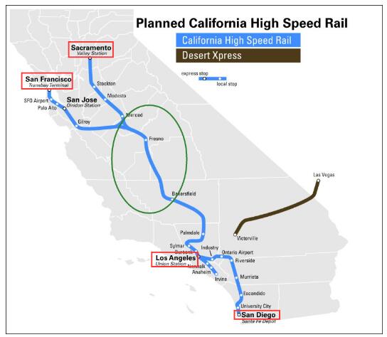 加州高铁项目,原图来自洛杉矶时报。注:红框中为原定计划连接的几大城市,绿色圆圈内是现任州长纽森削减项目后剩下的一小段。
