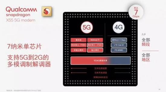此次高通推出的X55调制解调器,主要特点是覆盖5G到2G多模全部主要频段,支持独立(SA)和非独立(NSA)组网模式,是全球首款实现7Gbps速率的5G调制解调器。